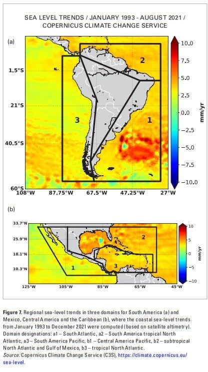 O relatório apontou também que o nível do mar aumentou a um ritmo mais rápido do que no restante do mundo, com destaque para a costa atlântica da América do Sul, o Atlântico Norte e o Golfo do México, ameaçando populações costeiras, contaminando aquíferos de água doce e inundando áreas baixas.