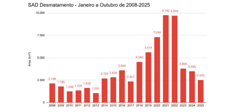 Além disso, outubro foi o quinto mês consecutivo com queda na derrubada da Amazônia, o que deixou o acumulado do ano 28% menor do que em 2024. No ano passado, foram detectados 3.490 km² de desmatamento de janeiro a outubro. Já neste ano, no mesmo período, o sistema identificou 2.530 km² de derrubada florestal.