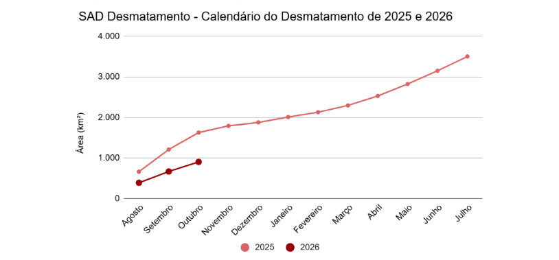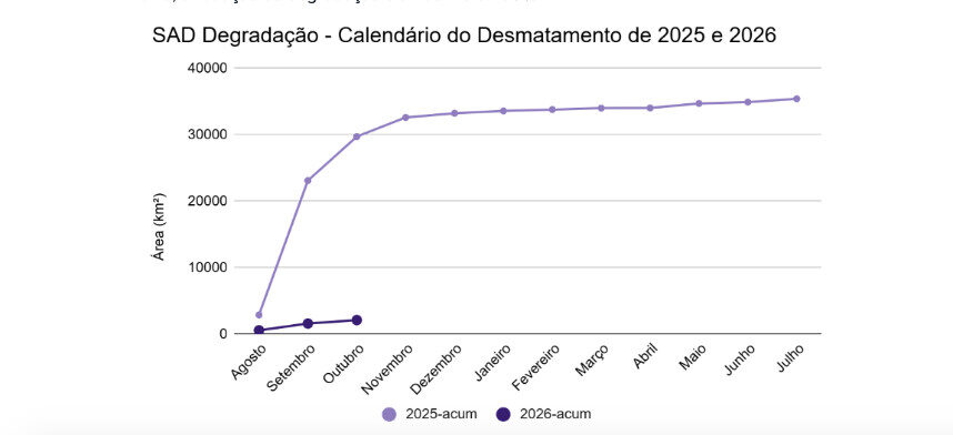Já no calendário de desmatamento de 2026, que vai de agosto de 2025 a julho de 2026, a redução da degradação é ainda maior: 93%.