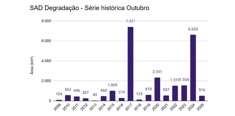 Além da queda no desmatamento, a Amazônia teve uma redução ainda mais significativa na degradação florestal, dano causado pelo fogo e pela exploração madeireira. Dados do Imazon mostram que as florestas degradadas passaram de 6.623 km² em outubro de 2024, quando houve uma alta significativa nas queimadas, para 516 km² em outubro de 2025, o que representa 92% a menos.