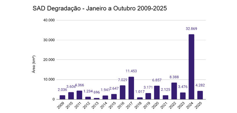 Com isso, o acumulado de degradação de janeiro a outubro fechou com queda de 87% em relação a 2024, ano em que os incêndios florestais fizeram com que a Amazônia tivesse a maior área degradada desde 2009, quando o Imazon começou a monitorar esse dano ambiental. Nos primeiros 10 meses do ano passado, a região teve 32.869 km² degradados. Já neste ano, foram 4.282 km².