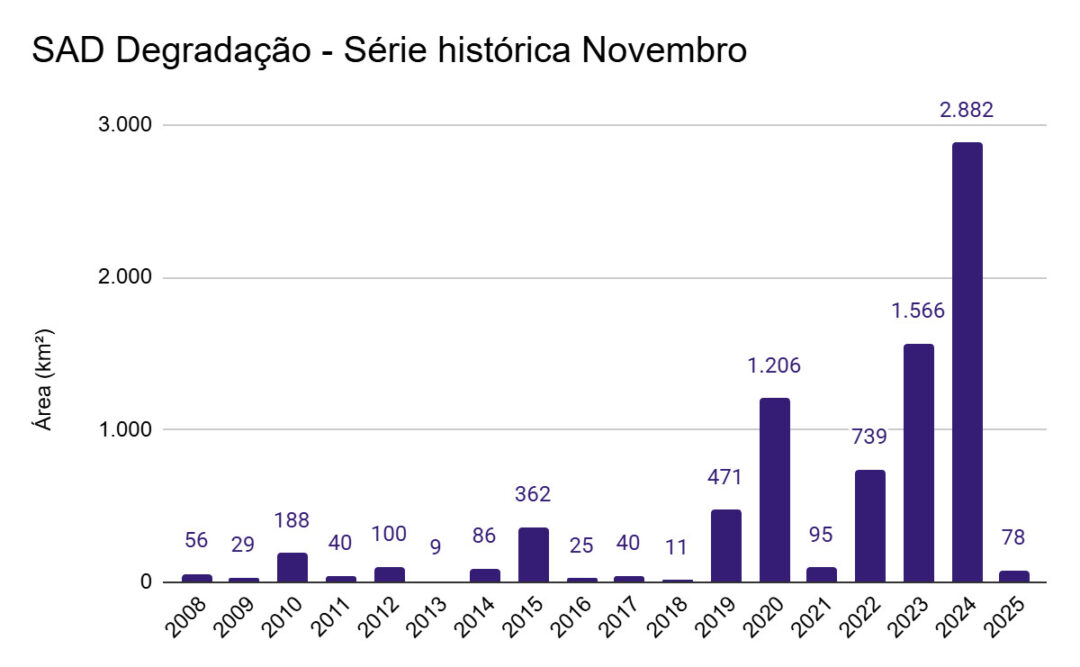 Apenas em novembro, a degradação passou de 2.882 km² em 2024 para 78 km² em 2025, uma redução de 97%. O estado com a maior degradação no mês também foi o Pará (59%).
