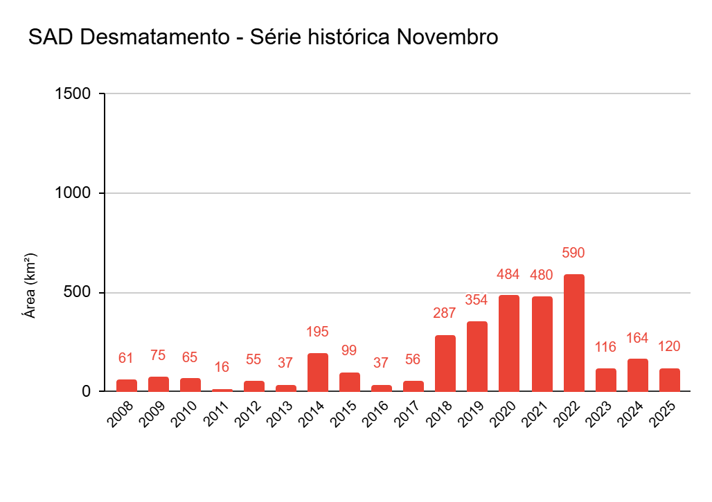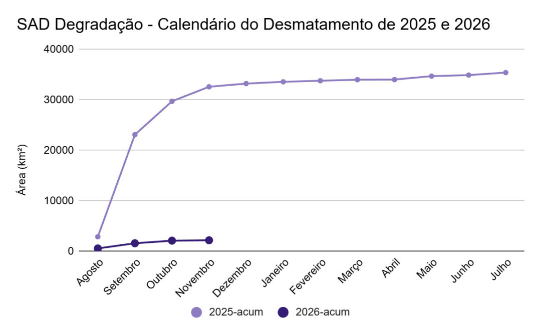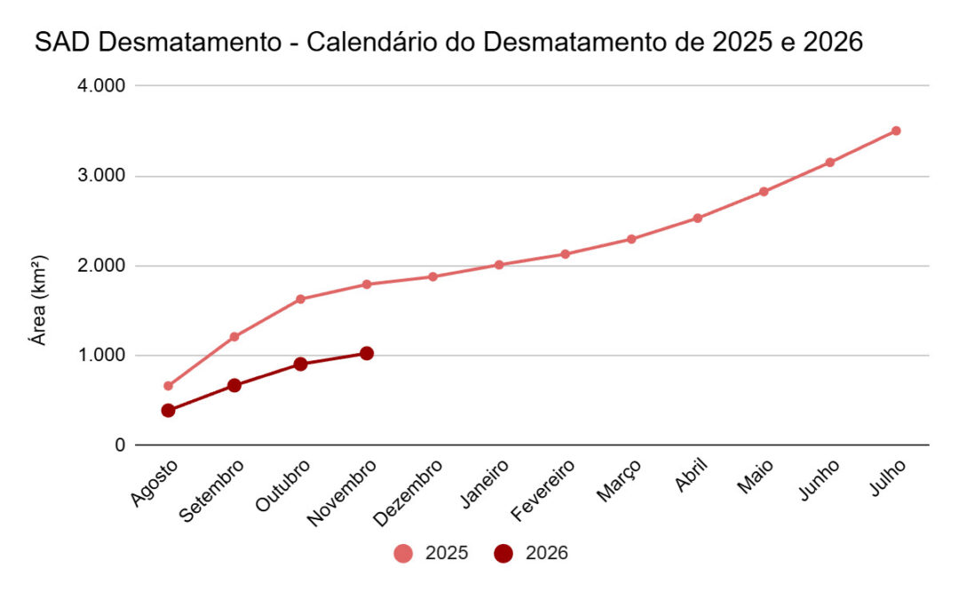 Novembro de 2025 é o quarto mês do calendário de desmatamento de 2026, que compreende o período de agosto de 2025 a julho de 2026. Considerando o acumulado dos quatro primeiros meses do calendário de 2026 e comparando-o com o mesmo período do calendário de 2025, há redução de 43% na derrubada até o momento.