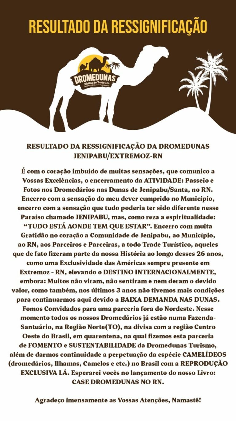 Os dromedários fizeram parte de uma atração turística nas dunas de Genipabu, em Extremoz (RN), por mais de 20 anos. Segundo a empresa responsável, a Dromedunas, as atividades foram encerradas em 2024 “por causa da baixa demanda”.