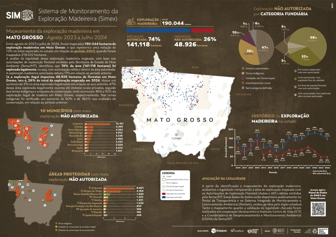 Em 2024, 46% da área explorada de forma ilegal para fins madeireiros em Mato Grosso estava localizada em Terras Indígenas (TIs) e Unidades de Conservação (UCs). Foram 22,4 mil hectares explorados nessas categorias, o que representa um aumento de 85% em comparação com o período anterior. A informação consta em estudo da Rede Simex, que analisou dados de agosto de 2023 a julho de 2024.