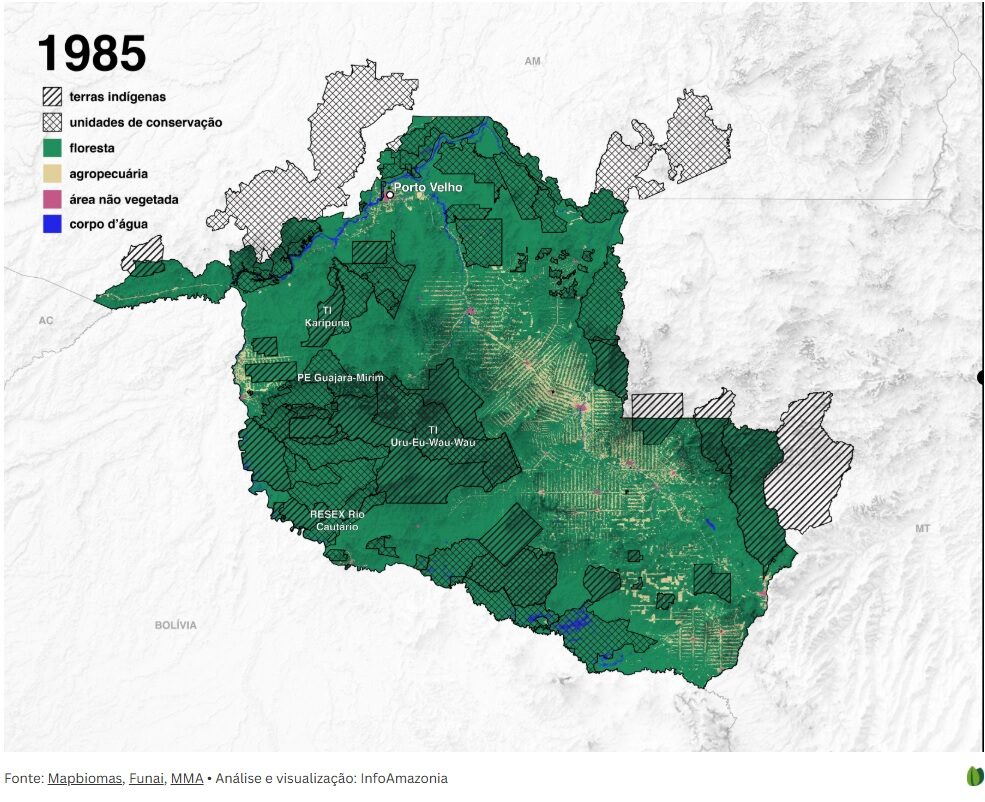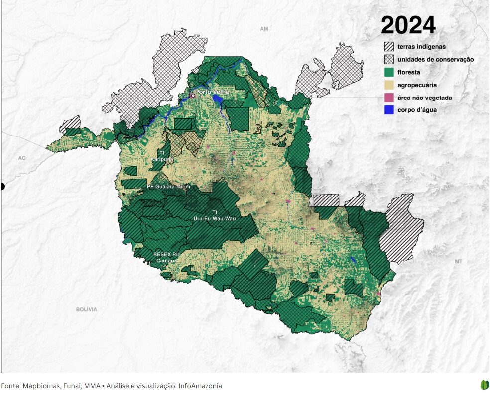 Os dados da plataforma MapBiomas mostram que, entre 1985 e 2024, a agropecuária avançou muito mais fora das terras indígenas (TIs) e das unidades de conservação (UCs) de Rondônia do que dentro delas.