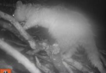 Registro noturno de armadilha fotográfica em Mato Grosso mostra uma cuíca-lanosa um ninho de gavião-real. É o primeiro registro de necrofagia na espécie.