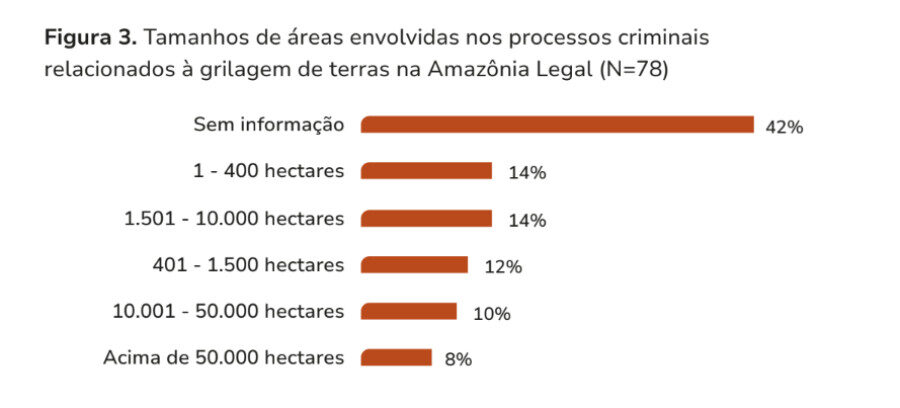 Quase metade dos processos (42%) não informava o tamanho da área-alvo da grilagem, mas 18% envolviam áreas acima de 10.000 hectares, o que é um território vasto, equivalente a mais de 10 mil campos de futebol em cada caso.