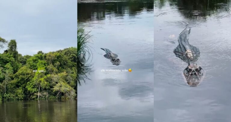 Jason é um dos jacarés-açus que vêm atraindo visitantes no Parque Nacional de Anavilhanas, em Novo Airão, no Amazonas. Especialista explica o comportamento.