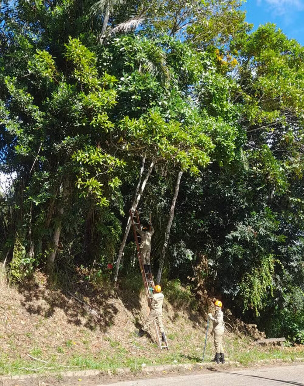 Agora, para alcançar as demais serpentes, que estavam em galhos altos, os bombeiros precisaram de cuidado e utilizaram motosserras, já que a área apresentava vegetação densa e proximidade com residências.