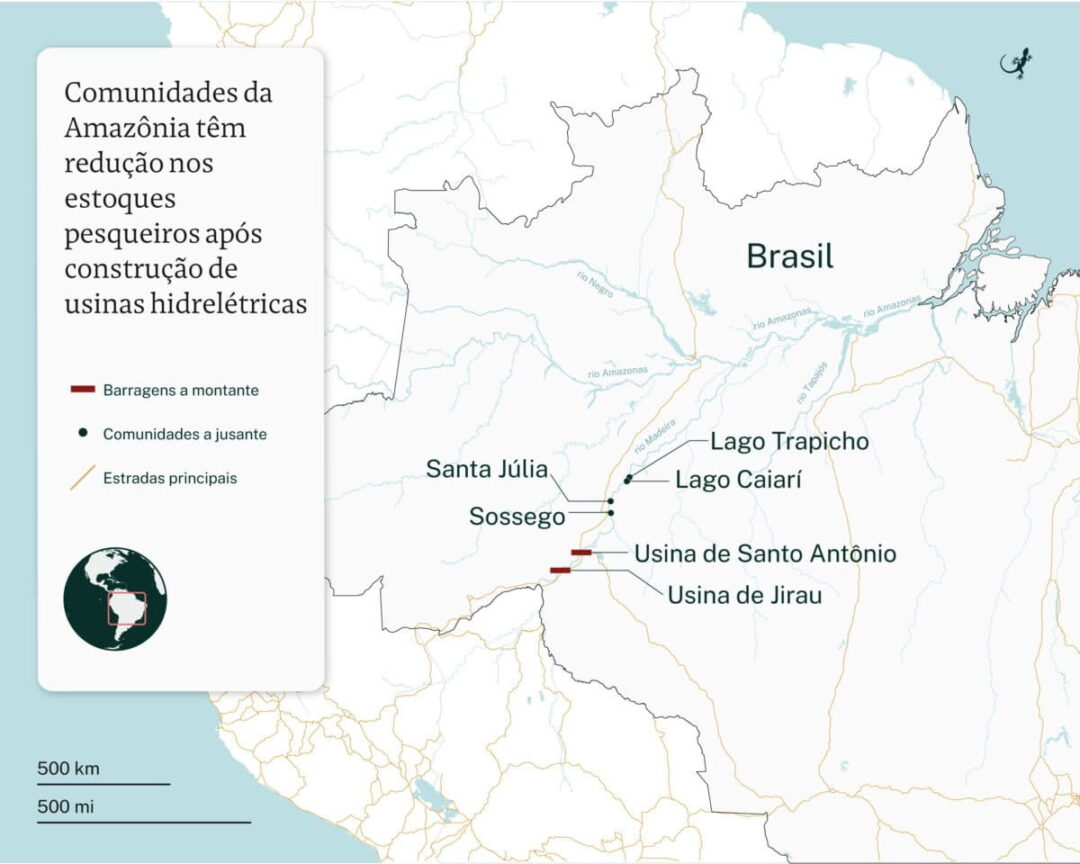 O Rio Madeira também foi afetado pela usina hidrelétrica de Jirau, a quarta maior do país, localizada a 120 km rio acima, que começou a operar em 2013. Desde então, uma ampla gama de estudos tem mostrado uma redução nos estoques pesqueiros após os projetos de infraestrutura ao longo do Madeira. Um artigo recente revelou detalhes sobre as comunidades e espécies mais impactadas — questões até então sem resposta — tendo os pescadores como protagonistas.