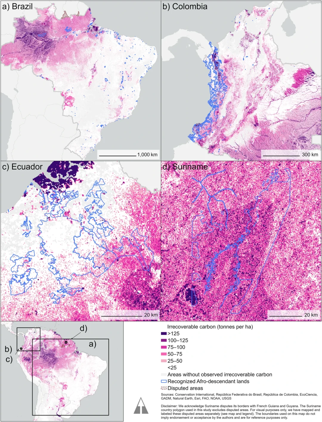 Mapas do estudo mostram concentração de biodiversidade (á esquerda) e carbono irrecuperável nas terras quilombolas pesquisadas. Imagens: Afro-descendant lands in South America contribute to biodiversity conservation and climate change mitigation. Commun Earth Environ 6, 458 (2025).