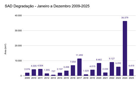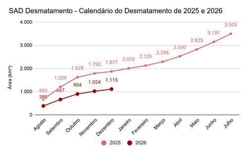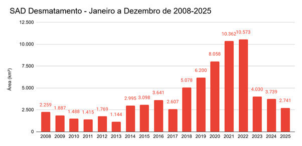 Apesar do mês de dezembro ter registrado alta de 7% na derrubada em toda a Amazônia, pois passou de 85 km² em 2024 para 91 km² em 2025, o acumulado desde janeiro fechou com redução de 27%. Isso porque a devastação passou de 3.739 km² de janeiro a dezembro de 2024 para 2.741 km² no mesmo período de 2025. Este foi o terceiro ano consecutivo com queda do desmatamento na região.