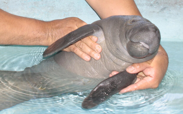 Alimenta-se de grande variedade de plantas aquáticas e semiaquáticas, e consome cerca de 8% de seu peso vivo em alimento por dia. Foto: Reprodução/Agência ParáA gestação dura 12 meses e normalmente, apenas um pequeno peixe-boi nasce. Foto: Débora Vale/Ascom Inpa