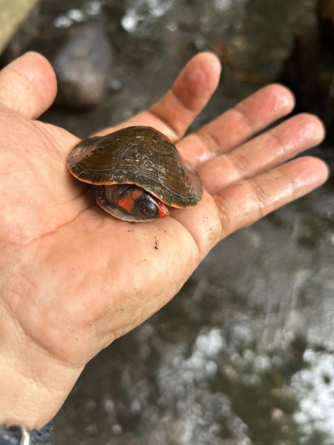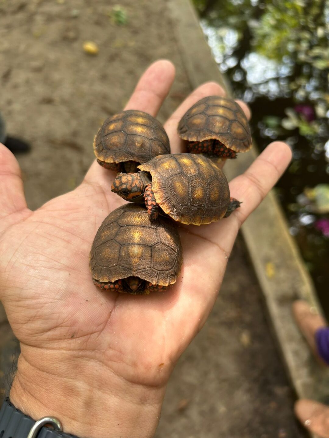 Filhotes de Jabuti. O nome vem por conta da coloração das escamas da cabeça e das patas avermelhadas. Foto: Reprodução/Instagram-@biologoamaralSão animais dóceis e tranquilos, que vivem durante muitos anos, podendo chegar aos 100 anos. Foto: Reprodução/Instagram-@biologoamaral