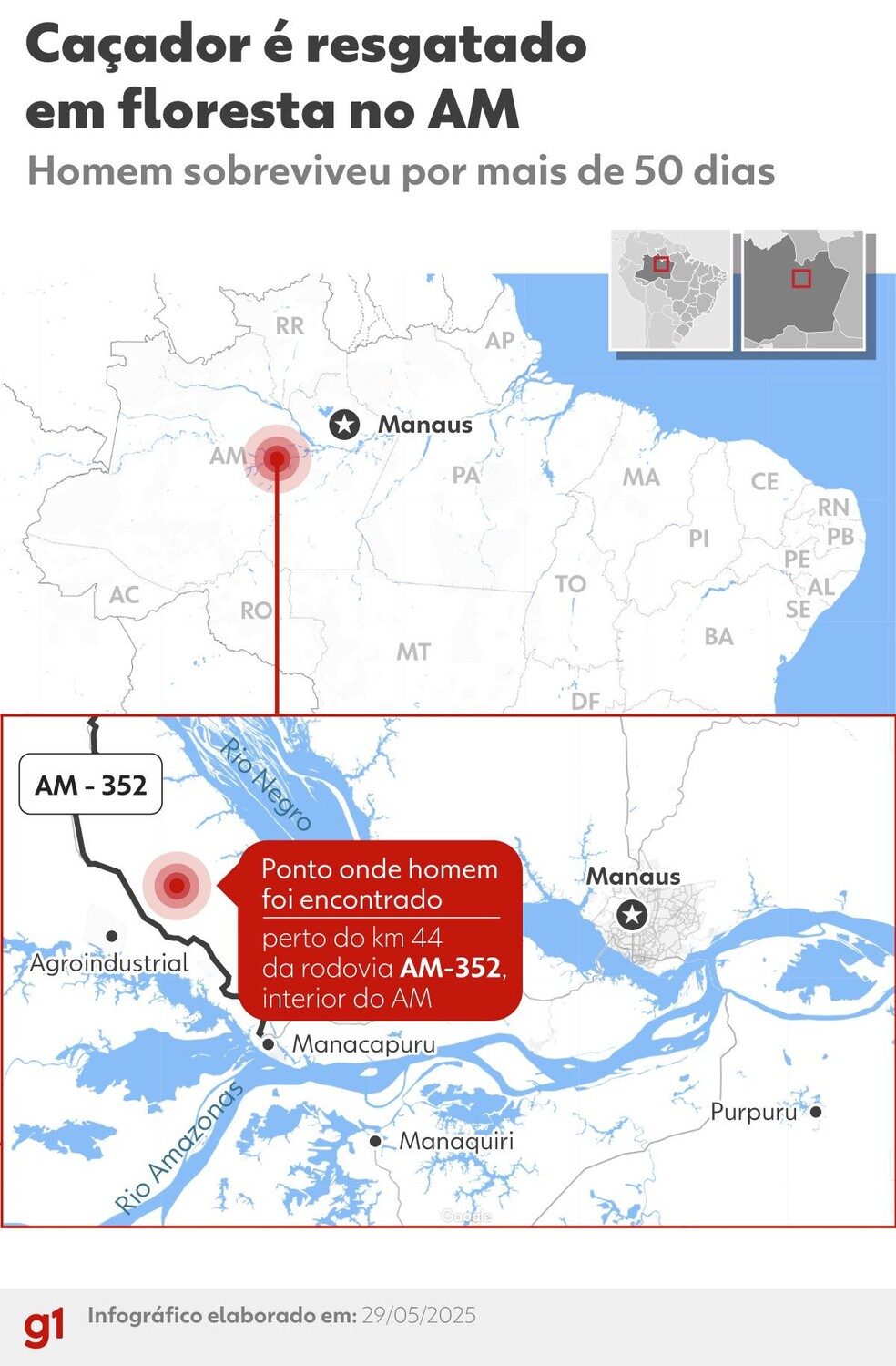 Após mais de 50 dias desaparecido, o caçador, foi encontrado com vida por moradores na manhã do dia 28 de maio, em uma área de mata no Ramal do Tumbira, no km 44 da rodovia AM-352, que liga Manacapuru a Novo Airão, no interior do Amazonas.
