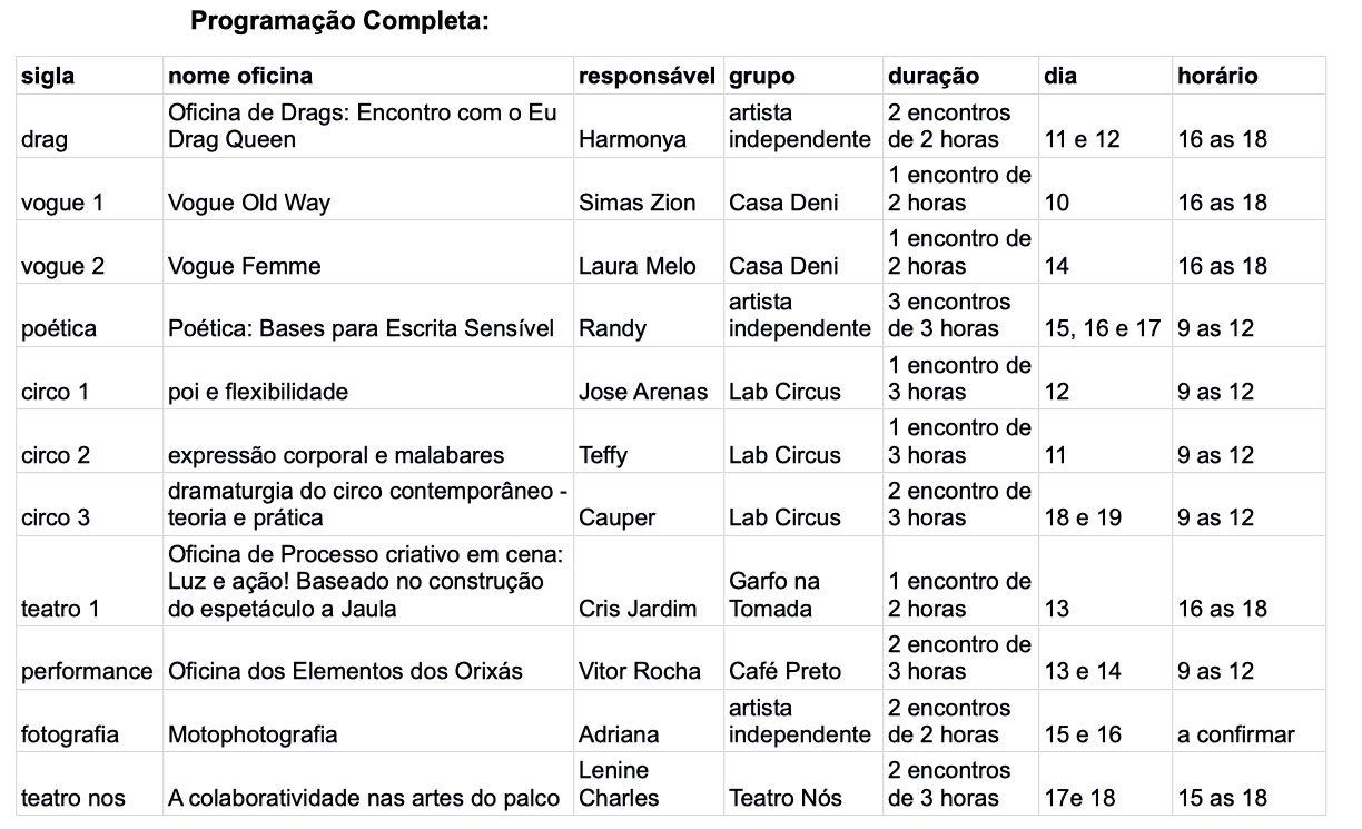 A programação abrange pelo menos uma oficina de cada grupo incubado no programa de residência artística. A programação é extensa por algumas atividades terem mais de um encontro e também por conta dos protocolos de segurança Pandemia Covid-19, que a organização do evento irá seguir com todos os cuidados.