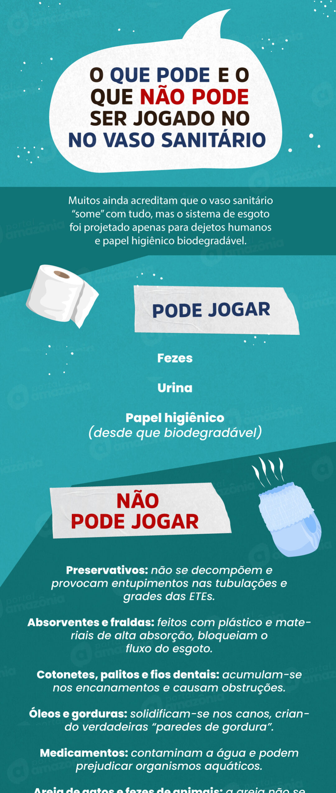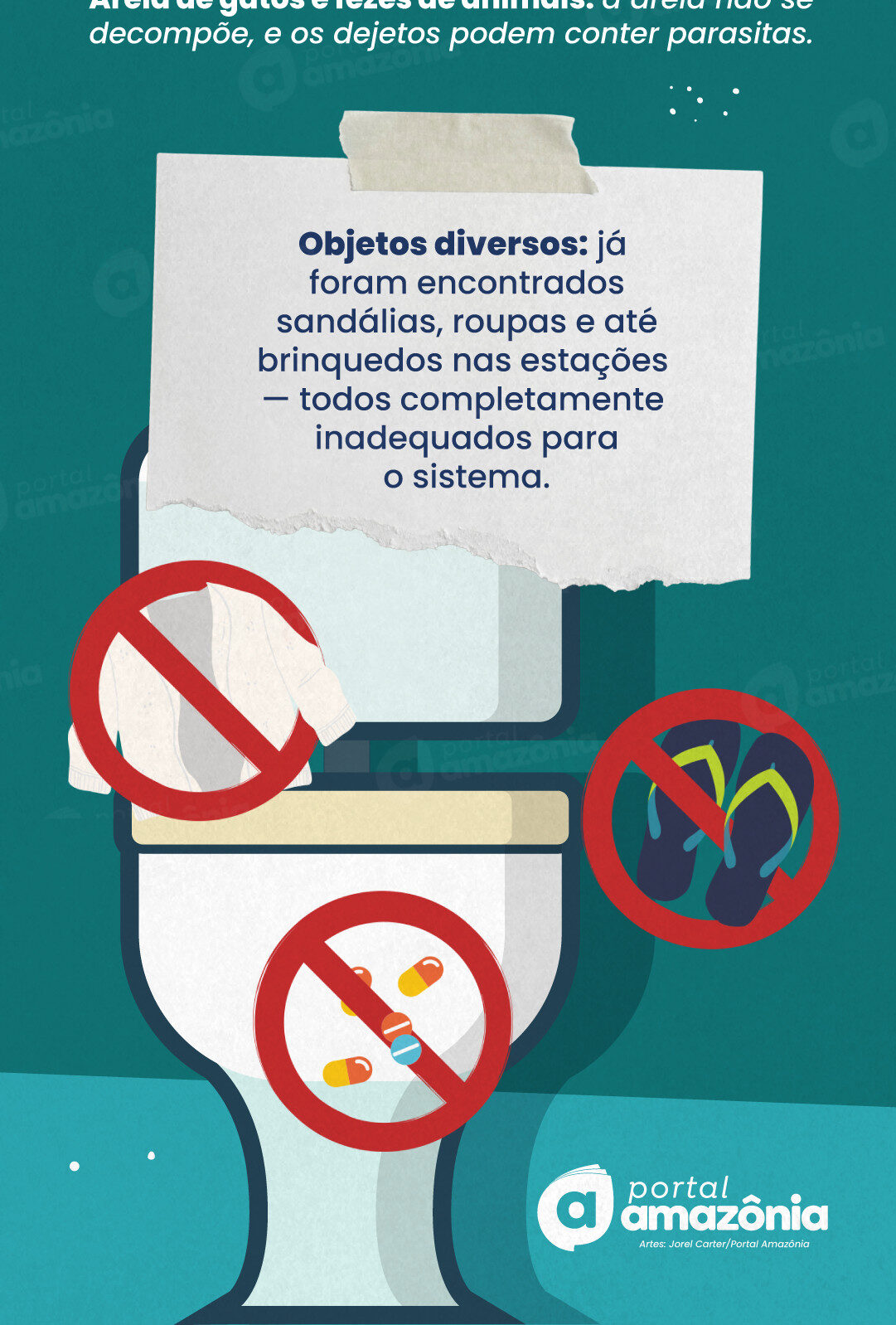 Além do impacto doméstico, o descarte incorreto afeta diretamente os igarapés e rios, que recebem parte da água tratada. Qualquer falha no sistema pode comprometer a fauna e a flora aquática, essenciais para o equilíbrio ambiental da Amazônia, alerta a empresa.