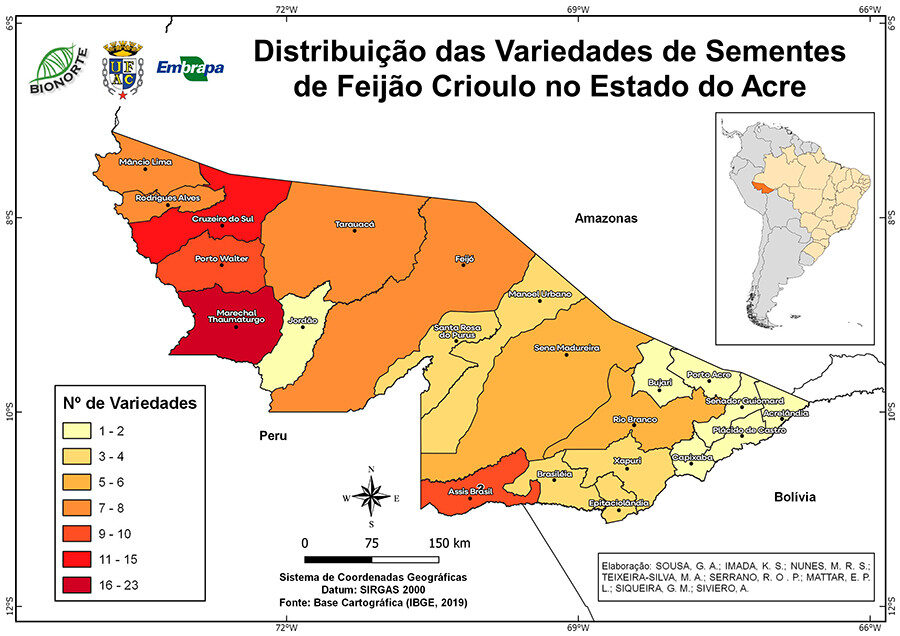 Outra parte da pesquisa foi a sistematização da ocorrência de variedades crioulas que ocorrem em todo estado do Acre. Esse trabalho resultou na elaboração do mapa da distribuição de variedades de feijões comum e feijão-caupi cultivados no Acre. Siviero explica que o cultivo dessa leguminosa ocorre em todos os municípios acreanos, mas a maior diversidade de variedades encontra-se no Vale do Juruá.